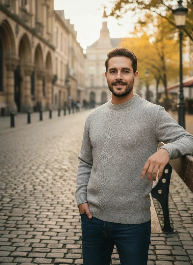 This textured knit men’s sweater combines timeless sophistication with everyday comfort. The subtle geometric weave adds depth and detail, creating a polished yet relaxed appearance suitable for any occasion. With its classic crew neck design and soft feel, it’s perfect for layering or wearing on its own. Ideal for office days, evenings out, or weekend comfort with lasting style.